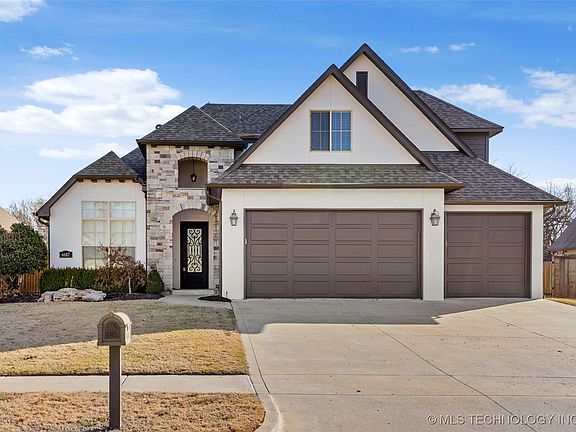 Bright and open with a very sought after Dodson construction floor plan. Backyard Oasis, oversized lot backing up to a green belt. Heated Saltwater pool with waterfall and large covered patio, perfect for entertaining. VERY PRIVATE! Large, open kitchen with a 6 burner gas grill, large pantry and island w 6mm granite. Large open living room. High end finishes. Inviting primary suite, soaking tub, gorgeous shower with multiple shower heads. Oversized walk-in closet and laundry room that connects. Guest suite downstairs as well as an additional half bathroom. Bright formal dining room with a view of the pool. Gorgeous hardwood floors. 2 bedrooms, game room huge storage room up, could be an office. Wired for surround sound speakers in-home and on the patio (just wired and speakers installed, no equipment included). Under ground gutters installed to run out to the street and french drain which helps to drain the pool. Tornado shelter installed in garage floor. New exterior paint. Neighborhood includes a park, neighborhood pool and a catch and release pond. Bixby School District! Easy access to the turnpike.