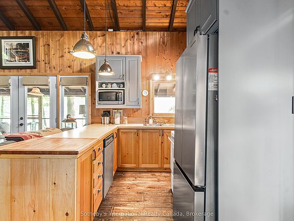 Welcome to your own private retreat on a picturesque point of land offering 188 feet of pristine shoreline and 1.41 acres of natural beauty. Accessible by boat only and just 8 minutes from the marina, this exceptional property offers peace, privacy, and the perfect setting for creating unforgettable memories with family and friends.The charming 3-bedroom cottage features soaring vaulted ceilings and an open-concept layout combining the living room, dining area, and updated kitchen. A striking stone fireplace anchors the space, creating a cozy and inviting atmosphere. The expansive wraparound screened-in porch spans two sides of the cottage perfect for entertaining, dining, or simply enjoying the gentle breezes and views. A 3 piece bathroom with laundry add convenience, while a separate bunkie with a sleeping loft provides ample space for guests. Down by the water, you'll find large docks with a covered gazebo section ideal for lounging in the shade, watching the sunset, or enjoying the excellent swimming with a sand and rock bottom shoreline. Included in the sale are a Searay bowrider, aluminum boat, two kayaks, paddle boat, and windsurfer - everything you need to start enjoying the cottage lifestyle immediately. A rare offering on a desirable stretch of shoreline. Don't miss this unique opportunity to own a fully-equipped, turnkey waterfront escape.
