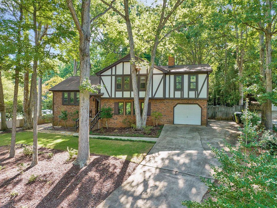 5 Bedroom Tudor with a pool in excellent central N Raleigh location minutes from North Hills shopping and dining. Established North Haven Neighborhood with lots of trees. Kitchen has been beautifully renovated in a modern white style and is Open Concept to the Family Room and Dining Room, which walks out to the back deck. Traditional Split Level floor plan with main level Family Room and downstairs Den with Masonry Fireplace for double the living room space. 4 Bedrooms including Primary upstairs, 1 Bedroom on lower level. Huge Owner's Retreat features a corner jetted tub in the Bedroom for maximum relaxing and Walk-In Shower in the En-Suite Bathroom. Pool is heated to extend pool season even longer! Storage room off attached garage is great for outdoor equipment. Front bedrooms recently repainted. Generator, refrigerator, washer, dryer, entertainment center, exercise equipment, and pool table will convey with acceptable offer. Pool covered/winterized for the season, covers convey and are porous to allow rainwater in and keep leaves out.