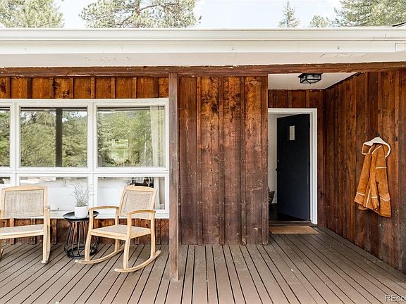 Modern refinement meets rustic charm in this mountain escape. Nestled in the mountains on a sunny, verdant acres, residents are welcomed by lush landscaping that envelops this fenced property w/ A-2 zoning. An inviting and expansive freshly stained front porch leads to the entry of the home opening into a flowing, ranch-style layout. Beautiful views unfold from a sun-drenched living room grounded by a brick, wood burning fireplace. Meander into an impressive, remodeled kitchen boasting stainless steel appliances, abundant cabinetry and a breakfast bar out looking the property. Retreat to a bright primary suite featuring a spa-like bath w/ heated floors and a steam shower. An additional two, sizable bedrooms afford space for a home office or guest accommodation. A large laundry room/flex space is an added convenience w/ a washer + dryer set. Outside, enjoy al fresco dining on a patio or create a backyard homestead w/ a chicken coop. Ample storage is found in a heated 2-car garage and heated shed—ideal for a home office, yoga studio or storage. Situated on a uniquely walkable lot, ideally located with easy access to phenomenal trails, downtown Evergreen or HWY 73 for weekend getaways.