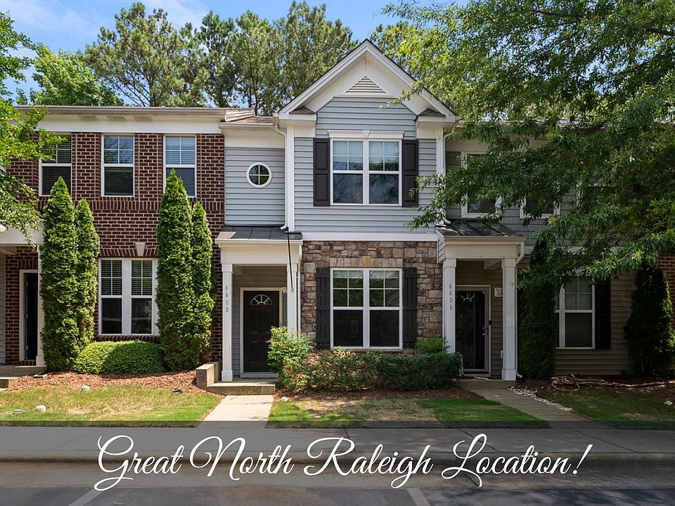 Awesome Townhome in Incredible North Raleigh Location! Open floorplan with hardwoods/LVP throughout, Perfect for hosting, this home features separate dining room and spacious living room with cozy fireplace! Kitchen features plenty of counter space and convenient pantry, and overlooks family room! This two bedroom home features spacious rooms with private bathrooms just steps from laundry closet! Concrete patio overlooks private, partially fenced yard and provides easy access to storage closet! It is a must see!
