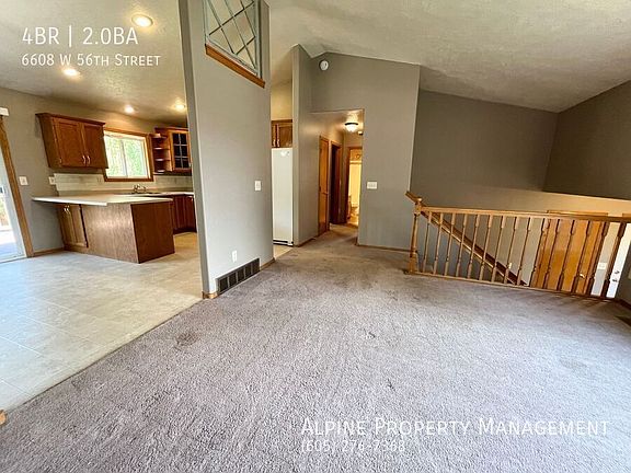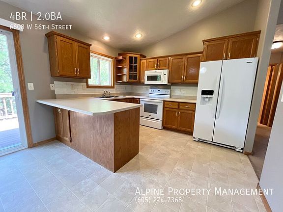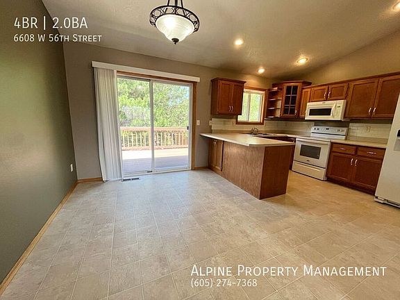 Call today to schedule a tour of this spacious 4 Bed/2 Bath single family home for rent in southwest Sioux Falls at 6608 W. 56th St! This split foyer has a fully fenced in backyard and an attached three car garage! The upper level features your first of two living rooms, kitchen/dining area with breakfast bar and slideouts to the backyard. You will also find two bedrooms and a full bath upstairs. The lower level includes another spacious family room, two more bedrooms and another full bath with tub shower. The home also has central heat/air and washer/dryer hookups!comfort! - $65 application fee per adult - $1995 security deposit - Tenants are responsible for all utilities and lawn/snow care - Pet friendly(2 max) and non-smoking - Alpine Benefits included for $25/month extra (see website for full detail) - Section 8 not accepted Professionally leased and managed by Alpine Property management Attached Three Car Garage Central Heat/Air Fully Fenced In Yard Non Smoking None Online Tenant Portal Pet Friendly Second Family Room Stove Tub Shower Washer/Dryer Hookups