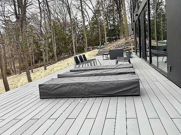 Minimalist modern family residence perched on a crest with walk-out lower level, floating above vast lakeviews, and floor-to-ceiling triple pane glass windows to allow transparency and panoramic views of lake with cantilever sunroom coupled with luminosity through the architectural design. The project was an intense collaboration of architect, client, builder, and landscape architect. A great amount of thought and design was incorporated into every detail throughout the entire process. The program created a low-slung linear volume overlooking an expansive view of the lake and blur the boundary between exterior and interior. The interiors are subtle and have predominantly monochrome tones to not distract from the ever-changing light and colors. Large, walk-out private deck for entertaining and relaxation with custom gas firepit, hot tub, European outdoor grilling area. Connective walk and steps to lower shoreline deck. Rooftop deck boasts a commanding view of lake with transparency and luminosity via custom LED lit glass balustrades, fireplace, and with custom entertainment lift. Unique topographic features gently cascade to shoreline. The project seeks maximum integration with the lake ecosystem, so its landscaping is based on the use of native species such as grasses, conifers, hardwoods. The main foci of the landscape program were the protection and preservation of the site’s existing mature trees and the amplification of the rolling topographic features. Hardscape materials include granite, concrete, and black oxide finished steel to gently impose on the naturally beautiful and ecologically conserved site.