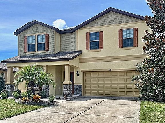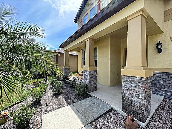 Welcome Home.As you pull up in front you will love the stone accents and the charming front porch. There is a pretty, frosted glass door insert with wrought iron in the front door leading into the foyer. Light and bright formal living room or flexspace in the the front of the house featuring new, wood laminate flooring. Walk into the huge, open, floor plan with a spacious kitchen offering granite counters,maple, wood cabinets, tiled backsplash and dual stainless steel sink on the center island breakfast bar which is perfect for entertaining. All Stainless appliances SBS refrigerator and a large pantry. Enjoy friends /family gatherings at the large dining space with sliding doors that open to the backyard.There is a spacious great room open to the kitchen and in the back of the house is an office/craft room and powder room, 2 car garage and under stairs storage closet. Ascend up the pretty spindled staircase to the 15 x 15 game /media room, pass the laundry room with utility sink and then you'll find 3 spacious bedrooms and a full bathroom with tub shower combo and spacious vanity cabinets and a sink. The huge Ensuite is 13.9' x 18.4 ' and offer a walk-in closet and bathroom with a walk in shower w/ glass door, and a large linen closet.. Plenty of room for everyone to spread out in this nearly new home.. There is a spacious backyard with a white vinyl, privacy fence and no rear neighbors ( backs up to Trillium park green space.). Whole house solar for low energy bills. Community amenities include huge swimming pool, pool house and a playground . Located just minutes from Veterans expressway for ez access to all Champion sporting events, beaches and the Tampa airport.Trillium Community has New EZ access road to US 41 and County line rd.