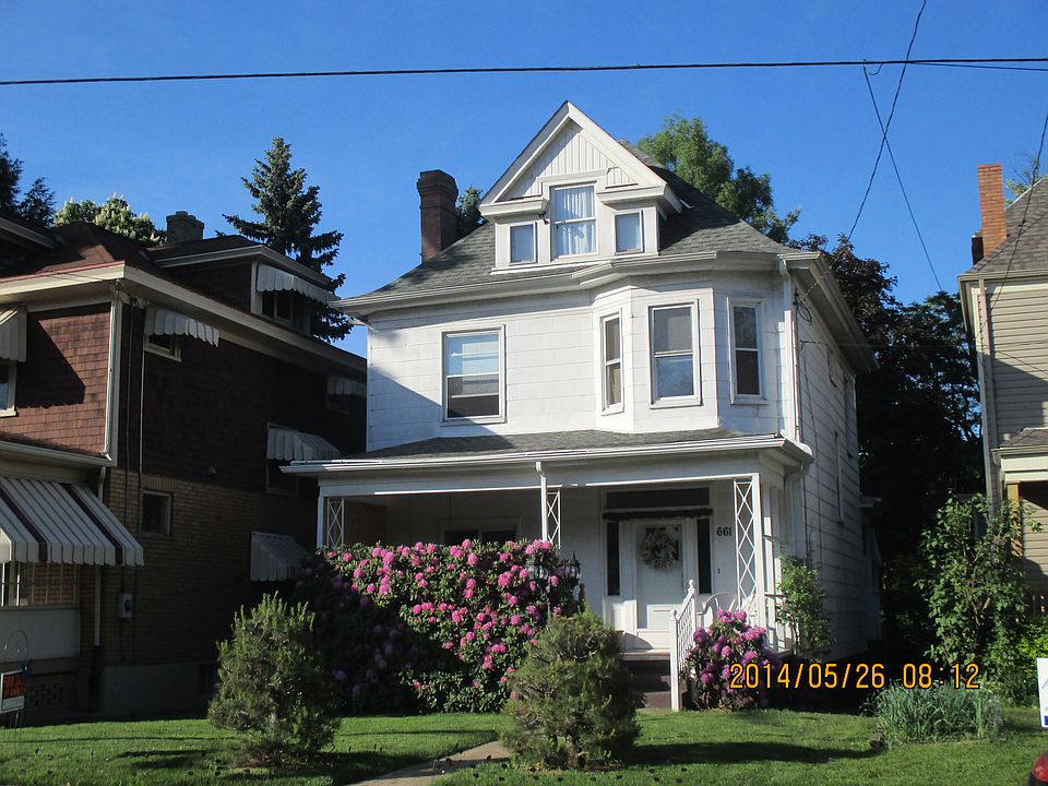 Lovely well-maintained home move in condition. Exposed chimneys and fireplaces with restored high ceilings. Two covered porches; landscaped and fenced in backyard. Second floor has four bedrooms and full bath; Third floor has two full size rooms, one with heat to it. Full bath on first floor. Located close to I279 and downtown Bellevue.