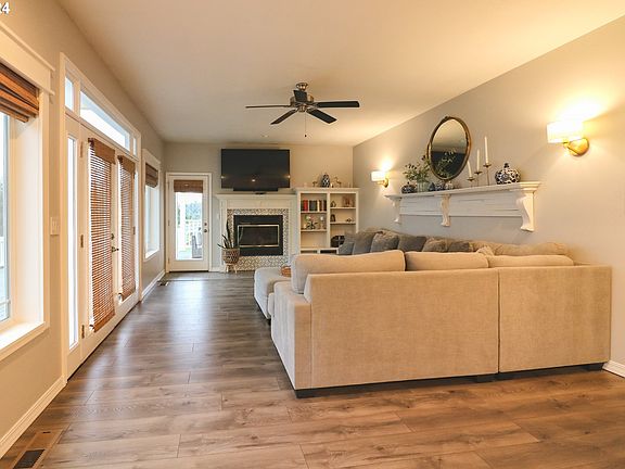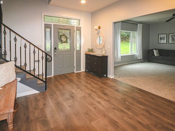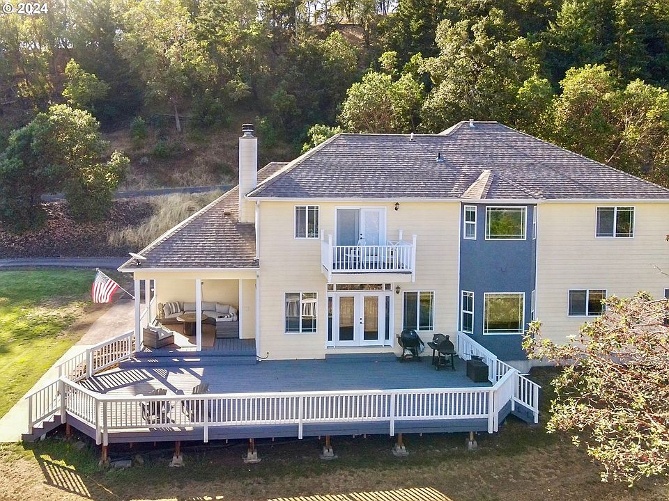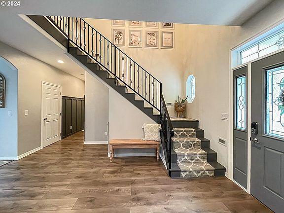 Presenting this gorgeous, executive, updated custom home located on 5 wooded acres. The property is minutes from downtown, shopping, medical facilities and restaurants and has quick access to I-5. There are views from every window in the house. The gorgeous well appointed kitchen features built-in double ovens, one convection, quartz countertop on the cook island, gas cook top, plenty of cabinetry, stainless steel appliances, an informal eating area and a formal dining room just off the kitchen. The family room has a wood burning fireplace, high ceilings, built-ins, a dry bar, high ceilings and French doors that open out onto the deck. The oversized primary bedroom suite features a balcony, 2 huge walk-in closets, barn doors, double sinks, jetted tub and a walk-in tile shower. The ample sized laundry room has a utility sink, tons of cabinetry and counter space. The remaining 3 bedrooms are roomy, two have walk-in closets and the third has a vaulted ceiling. Upstairs there is also a large, easy to access to storage room off the primary bedroom. The covered and large open deck is located on the back side of the home for year 'round barbecuing and endless entertaining. Check out the oversized three car garage and there is plenty of room in the driveway to park extra cars, toys or an RV. Plus, there's a play structure for children, a fire pit and a good sized tool shed for additional storage and room for a shop. Make this beautiful property with large living spaces and room to spread out your forever Oregon Dream Home!