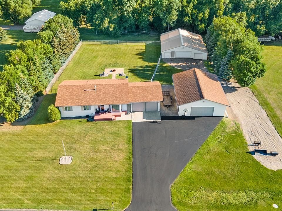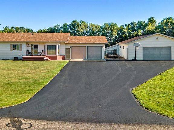 Looking for lots of parking and storage?! This home is the one for you. This home is on an acre lot, fully fenced, 3 garages, and only 10 minutes from Minot! Walking in, the home is very open and spacious! There is a sunken living room with a large bay window. The kitchen is roomy with a good sized island and is open to the dining area. Plenty of space for lots of entertaining. Moving down the hall you will find bedrooms 1 & 2 which are both good sized along with a full bathroom with a jetted tub. The master bedroom is at the end of the hall with a walk-in closet and a 3/4 en suite bathroom. Heading downstairs, there is a massive hang out space. There is a living room, a game area, and bar area. There is another bedroom with egress and a 3/4 bathroom with an updated walk-in tiled shower. There is also two large storage rooms on this level. Outside, the 42x32 detached garage has floor heat, floor drains, is insulated, and sheet rocked. There is another detached 46x50 pole barn style garage and it has 3 garage doors. The middle garage door has concrete floors, and the two side garage doors are dirt floors. The backyard has a sizable deck with a patio below and a built-in fire pit. There are also water fountains and a pad for a future hot tub. There is additional parking along the side of the detached garage for RV's or boats!
