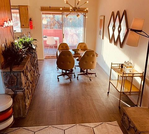 Welcome to 6610 Alpine Ave. This home is currently being run as a very successful short term rental and will include all of the furnishings. A true mid-century, one of a kind, home that was constructed in 1964 with a symmetric brick pattern and classic rock accents. The location doesn't get much better; 1-2 blocks to restaurants, markets, and 10 minute drive from North Joshua Tree Park entrance. It sits on a very large lot (approx 16,000 sq ft) with plenty of room to expand. The positioning of the home allows for amazing sunrises and breathtaking sunsets with an abundance of natural light throughout. The setback allows the owner the option of using a circle drive and or the driveway leading to the large single car garage with workshop. The floor-to-ceiling stone wood burning fireplace welcomes you into the spacious living room. The accents continue into the dining room with a rare indoor stone planter that runs nearly the full length of the kitchen. The kitchen has ample counter top space with a spacious window above the dual sink with views of the famous Joshua Tree Park. The full bathroom retains all of the original tile which the owner painstakingly restored. The covered flagstone patio is an ideal place for alfresco dining and or venture further into the gated backyard and experience the oversize stone fire-pit while taking in the star studded night sky that the desert is famous for. One must see this gem in person to appreciate it fully. By Appt Only. Buyer to verify.
