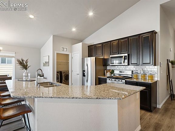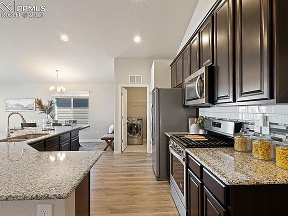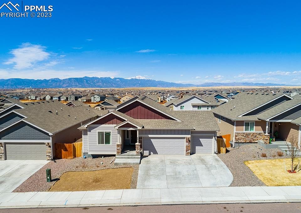 New SOD in front and back, carpets have been professionally cleaned and home comes with a 5 year roof certification!! Discover a magnificent property located in the sought-after Lorson Ranch East community of Colorado Springs. This impressive EVEREST floor plan features 5 bedrooms and 3 full baths, perfect for creating unforgettable memories with your loved ones. As you step inside, the main level welcomes you with an open and bright floor plan. Three bedrooms, two baths, and laundry facilities on this level provide convenience and easy living. The owner's suite boasts a 5-piece bathroom that exudes elegance and sophistication. The vaulted ceilings in the living area provide an airy ambiance, while the deck off the living room offers breathtaking mountain views. The kitchen is ideal for the home chef, featuring beautiful granite countertops, Whirlpool stainless steel appliances, and a gas stovetop. The luxury vinyl floors throughout the entryway, kitchen, dining, and living room is both impressive and easy to maintain. The walk-out basement is a unique feature of this property, offering easy access to the outdoor patio and backyard. With 2 additional bedrooms and 1 full bath, this level is perfect for guests or as a private retreat. The entertainment area is open and spacious, ideal for hosting gatherings and creating unforgettable memories. The built-in wet bar adds extra convenience and practicality to the already impressive space. This property also features a 3-car garage providing ample space for your vehicles and storage needs. The backyard is fenced, offering added privacy and security. The community includes a playground and walking trails, perfect for outdoor recreation and exploration. Plus, this property is conveniently located within 15 minutes' proximity to Ft Carson, Schriever SFB, and Peterson AFB, and just a short 3-minute drive away from Grand Mountain elementary and middle school.