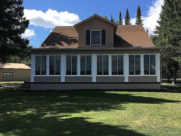 Hubbard Lake’s North Bay. This charming year-round home, spanning 2,096 sq ft, with a blend of comfort and lake living. With 3 spacious bedrooms and 2.5 well-appointed baths, this residence is perfectly designed for both relaxation and entertaining. Step into your enclosed 300 sq ft three-season porch with panoramic lake views when dining or relaxing. The first-floor master suite and ensuite ensures a peaceful haven for the homeowners. The eat-in kitchen features warm hickory cabinets and is perfect for casual dining, while the living room provides ample space for gatherings. An oversized laundry room adds convenience and functionality to this already accommodating home. The second floor presents two generous bedrooms and a versatile bonus room with breathtaking lake views - ideal as an additional bedroom or a dedicated office space. Enjoy 70’ of sandy, level to the lake frontage, and a steel seawall. The lot extends 400+ feet deep, for abundant space for outdoor enjoyment. Additional features are a detached 2-car garage and a 30’x40’ pole barn with electricity and cement floor. Recent updates include a newer roof and gutters, water softener, reverse osmosis drinking water system, and newer appliances including a dishwasher, refrigerator, and washer/dryer. This home is well-insulated, including the crawl space. Whether you’re seeking a year-round residence or a seasonal escape, this lakefront home provides a backdrop for a relaxed and enjoyable lifestyle.