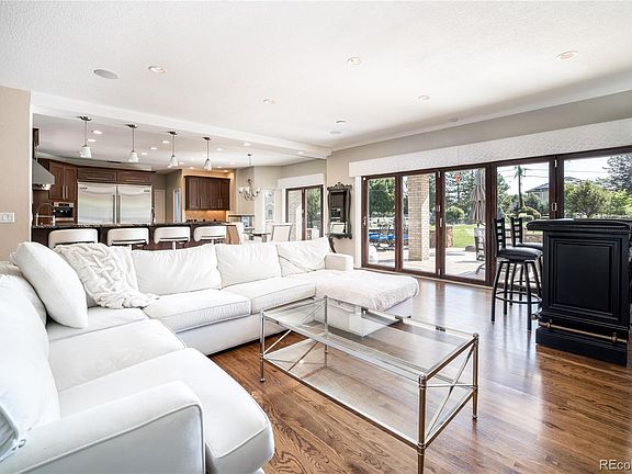 Beautifully updated ranch style home on .98 acre lot steps from Cherry Creek State Park and Valley Country Club, The open bright interior features a Pro Chef's stainless Viking Kitchen with center island , breakfast bar and large eating space, the adjacent Great Room with built in fire place perfect for family and entertaining and opens directly onto a large covered tile patio with full entertainment system with dining and sitting area, the Formal dining room can seat 12, Huge Primary Suite with sitting room, luxury 5 piece bath and custom walk in closet, The lower level offers a family room, bedroom suite with full bath, separate 3/4 bath, Office, 32 x 16 gym/workout area, a full laundry with mop sink, built in cabinetry and lots of storage, Upgrades and Extras include 6 Garage spaces - 3 car attached and 3 car detached, Tile and hardwood flooring, Wolfe steam oven, Miele coffee station, Wine cooler, Nana Wall system that opens on to patio, built in hot tub, batting cage. The main floor pantry can be converted back into laundry room/water and electric are behind the walls, Schools are Cherry Creek High, Campus Middle and High Plains