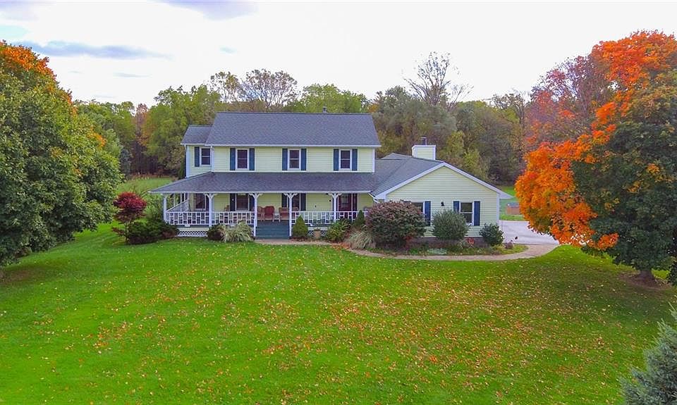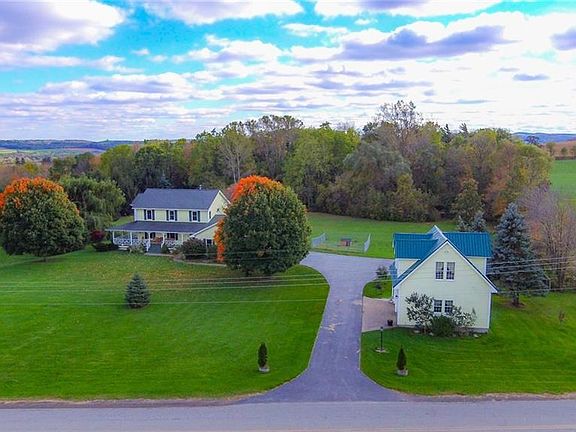 Captivating country estate situated on almost 5 acres offers privacy (only two homes on Tufts Rd), 4 beds, 2.1 baths, 3,608 SQ FT & potential in-law apt. within 30 min of Henrietta & 45 min of Buffalo. Updated colonial features lrg kitchen w/ quartz counters, cherry/oak cabinets, double oven & brkfst bar & opens to formal DR w/ crown molding, bay windows & door to wrap-around porch. Spacious FR has cathedral ceilings, a wood-burning fireplace & walkout to back deck overlooking orchard w/ mature fruit trees. Master upstairs w/ 3 beds & office. Finished basement offers sauna, dry bar & walkout to patio. Outbuilding w/ extra garage space & possible in-law apt. or business upstairs! Natural gas, generator, 1st-flr laundry, C/A, prime hunting! RARE Genesee Cnty property w/ incredible potential!