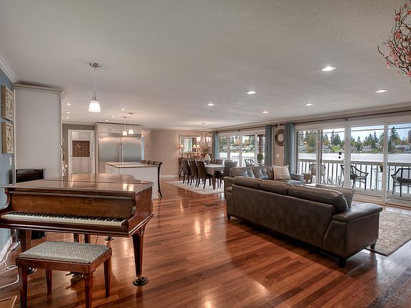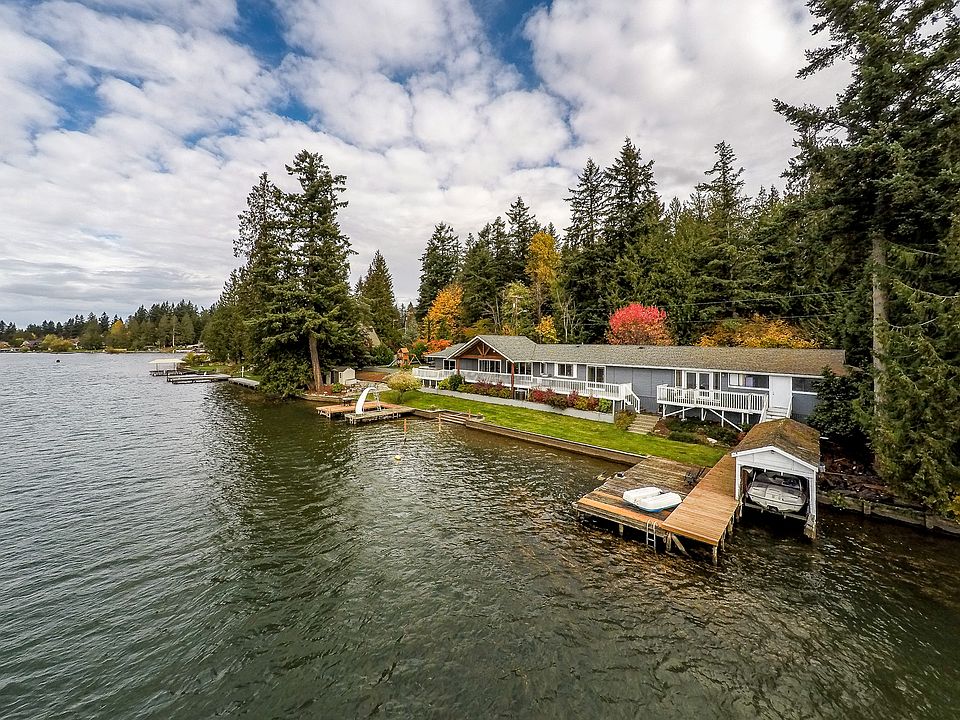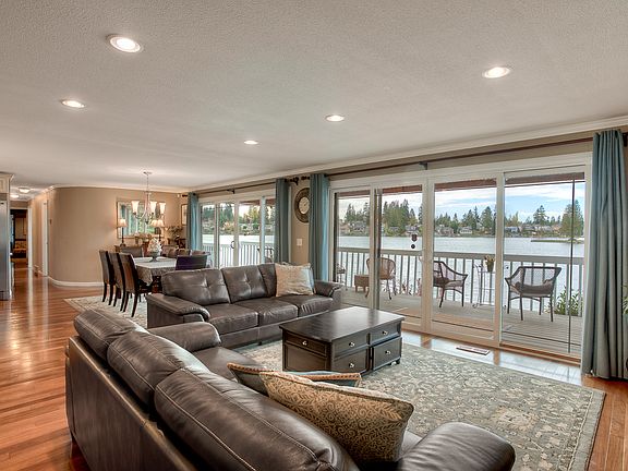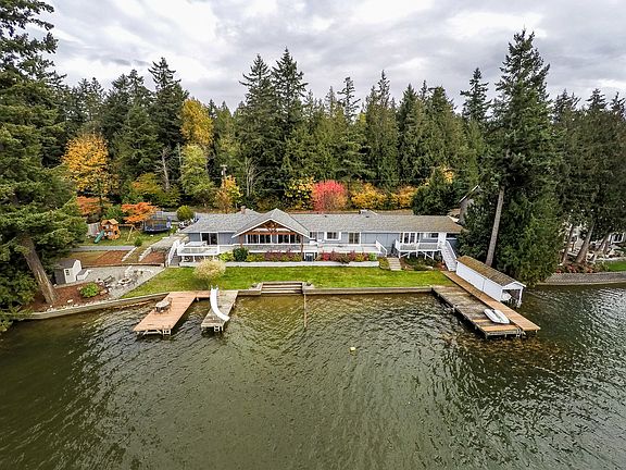 Stunning 4 bedroom plus den/office, 2.75 bath on 220 ft of Lake Tapps waterfront! Great room concept: living room, dining room, and kitchen all look out over the water. Western exposure means Sunsets every night from every room, and more sun to play during boating season. Three docks, boat house, water slide, RV, guest parking and much more! Kitchen is an entertainer's paradise, with oversized, 60" double door fridge/freezer, huge pantry, and views of the lake. Walk-in closets, dedicated theater room, three-car garage. Property is fully fenced (PVC), and entire house is wired to a generator. Don't miss this!