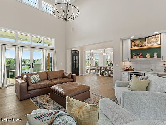 Welcome to this stunning home featuring an open-concept floor plan and vaulted ceilings in the spacious family room. Enjoy elegant touches throughout, including wide crown molding, a gas fireplace, and a built-in wet bar complete with ice maker, wine fridge, and sink are perfect for entertaining. The chef's kitchen is a dream come true, boasting KitchenAid appliances, quartz countertops, dual ovens, a gas range with pot filler, hot water dispenser, and a walk-in pantry with open shelving and full cabinetry. Designed for first-floor living, the main-level primary suite features a cathedral ceiling with custom architectural detailing. The luxurious en-suite bathroom includes a quad-spray shower system for a spa-like experience. A dedicated office with custom built-ins and lots of light.
