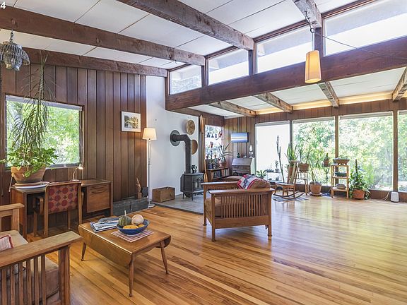 Unique Pacific NW one-level work of art, on an oversize corner lot. Chock full of built-ins, beamed ceilings and one-of-a-kind redwood cabinetry. This house begs you to cozy up by the woodstove, drink tea, and stare out the floor-to-ceilings windows at the rain. The house needs some updating, but it is solid and comfortably livable. The oversize lot is gloriously teeming with life: apple, pear, persimmon, fig, plum, grape, currant, berries, raised beds, chickens - an urban homesteader's dream. Includes a koi pond and hot tub. Fantastic close-in location near Mt Tabor, with easy access to Max, and I84. Amazing opportunity to restore a special home. OPEN SUN 6/2 1-3pm