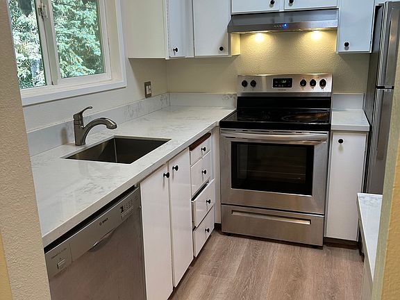 This 2 Bedroom, 1.5 bathroom apartment is an upstairs unit in a 4-plex. The apartment is located in a quiet neighborhood near the intersection of Vermont and Oleson Road. The street ends in a cul-de-sac, so there is little through traffic. Neighbors are often walking with children and pets in the afternoon and evening. The neighbors in this building are quiet, respecful and have all been long-term tenants. The apartment is 900 sq feet and includes a large, covered deck that stays dry even in wet winter months. New laminate wood flooring throughout adds to the clean appeal of the apartment. The kitchen includes a garbage disposal, stainless steel dishwasher, range, hood and fridge. Counter tops are granite in the kitchen and bathrooms. There is ample storage space in the apartment, including a large entryway closet and three bedroom closets. Coin operated industrial washer and dryer are located on the premise and are for use of tenants only. Included is the rent is a large garage space accessible by remote and one off-street parking space. The garage space includes space for bikes, gear, additional storage, etc. Pets ok on a pet-by-pet basis. Apartment is approximately 10 minutes from downtown Portland and 5minutes to the heart of Beaverton. All utilities, except electricity and cable, are included in the rent. One year lease followed by month-to-month rent thereafter. If you'd like to see the apartment please email and we can arrange a convenient time for viewing. This property is using RentRedi for rent payments. With RentRedi, you can easily submit rent payments, boost your credit by reporting rent payments, sign up for affordable renters insurance, and more from the app!