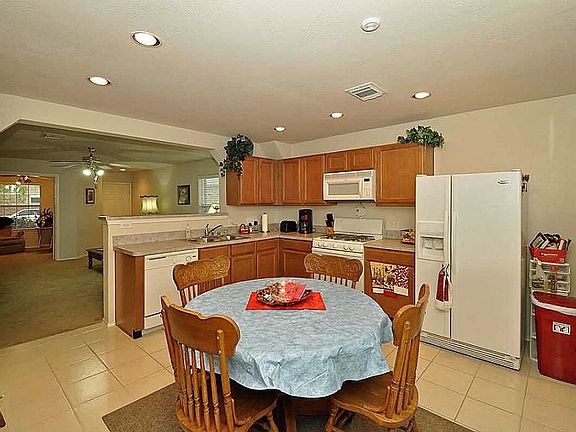 Charming home with brick front porch! 2 bedrooms, 2 full baths & an extra room that could easily be a 3rd BR, study, play or craft room. Eat-in kitchen with tile floor & upgraded cabinets & nice counter space. Both bedrooms have walk-in closets. Garage is finished out & there is decking in attic for easy storage. Large, private backyard with covered patio! Double paned windows, blinds & neutral decor throughout. Fridge, washer, dryer negotiable! Move-In ready!
