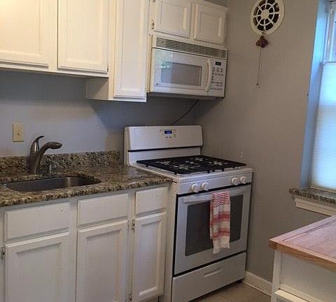 Kitchen with cabinets and granite counter tops, refrigerator, gas stove, and microwave oven.