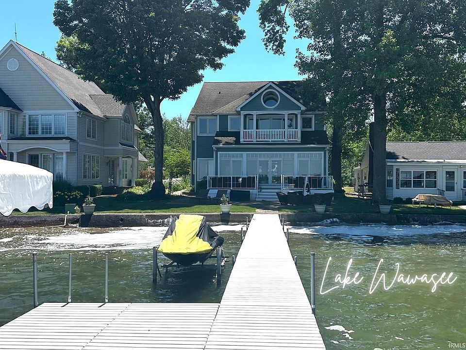 Welcome to Lake Wawasee! This stunning, open floor plan home is sure to please. 5 bedrooms, 4 baths, with wood floors throughout. Primary bedroom w/ensuite is located upstairs with fantastic lake views. Another ensuite bedroom is on the main floor, which can double as an office. The open kitchen with large eat in island overlooks the large dining and living room area. Across the street is a detached 2 car lot on large lot. Sandy lake bottom and flat walk to lake, ideal location, located close to SW trail system. Entered into MLS for informational purposes.