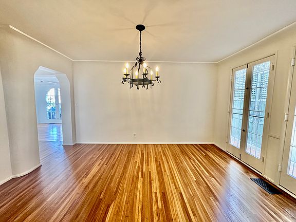 Elegant Living Spaces: Formal living room with dramatic Moorish-style floor-to-ceiling keyhole windows and a separate formal dining room with French doors that open to natural light.