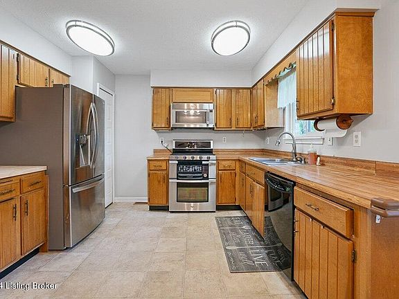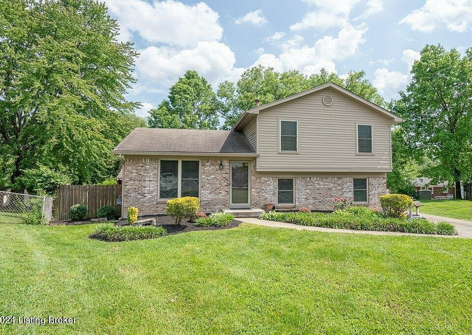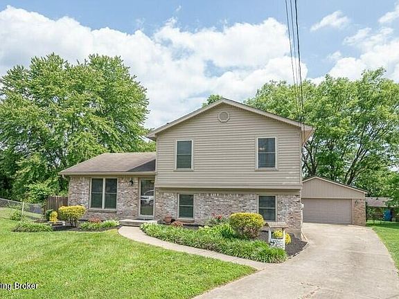 This wonderful home is available after decades of ownership. Welcome to this well loved 3 bedroom, 2 full bath home on a cul-de-sac lot with convenience to shopping, dining, and I-265. As you enter the main level, you are greeted with hardwood floors in the spacious living room. Next to the living room is a large eat-in kitchen with appliances, and a pantry closet. The kitchen overlooks a a lower level den with fireplace and walk-out to spacious fenced yard. The lower level also offers a bedroom, full bath, and laundry/mechanical room. The upstairs level offers the large primary bedroom with walk-in closet, a beautifully updated bathroom with double vanity, tub, with a separate shower, and another bedroom. There are many updates throughout the house including fresh paint, new carpeting, updated lighting fixtures, and hardware. If you enjoy outdoor space, there are numerous options with an above ground pool wrapped with a deck, a playset, playhouse, extra storage space, and a 2 1/2 car garage. Not only does this home offer a place to live but also a place to entertain.