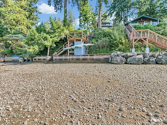 Rare Opportunity to Remodel or Build your Dream Home on this one-of-a-kind medium bank waterfront perched above Gorgeous Filucy Bay. You'll love this West Facing, protected bay location as you enjoy the amazing Sound views, clamming, boating, watching wildlife pass by, magical sunsets & nature surround. The multiple structures include main home, possible ADU, outside bath room for yard or beach clean up & large detached garage w/Shop for all of your tinkering. Bring your tool belt, TLC & vision. Amenities include 2 living rms, 2 kitchens, 3 wood stoves, RV hookup, BRAND NEW Septic Sys & tons of parking. Ideally nestled on private road in quiet community. A perfect heirloom retreat, respite or weekend get-a-way. Public boat launch nearby!
