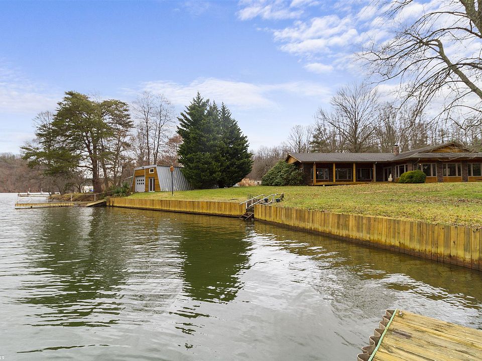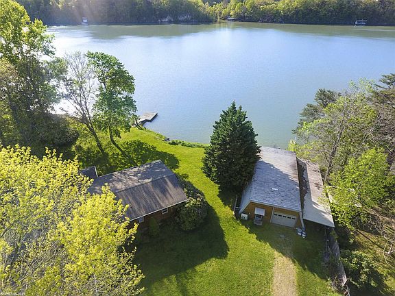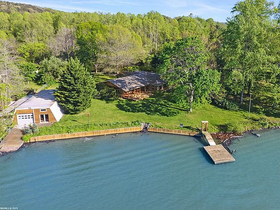 Beautiful one level home with 190 feet of waterfront nestled on one of the PREMIERE lots on Claytor Lake. A wall of windows offers an amazing view of the lake from almost every room. This craftsman style great room has exposed beams, rich wood accents, propane stove and gleaming hardwood floors. The chef in your home will be delighted with the GE stainless steel appliances and nostalgic knotty pine cabinetry. Two nicely sized bedrooms, a bonus office space, two ceramic tiled baths and a sun-room with a hot tub. The outdoor space has an amazing lakefront covered porch, over-sized carport, mature plantings which includes some fruit trees/bushes. The Guest house has over 500 finished square feet, full bath, HVAC, wood flooring, loft area a view of the lake and it's own private waterfront deck. Adjoining boat house features single garage with storage. You also have a floating dock, cat walk and steps leading into the lake.