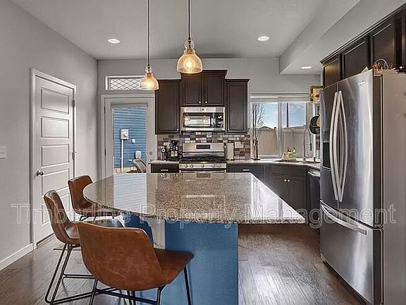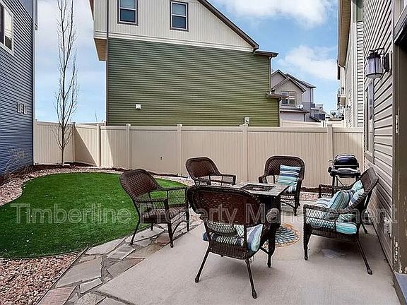 Lovely 3 story home offers 3 bedrooms, 2.5 bathrooms, over 1,900 total square feet and a 2 car garage! Main level includes 9ft ceilings, 1/2 bath, large living room and a walkout from the kitchen. Granite countertops and a large kitchen island that seats 6 or more. The backyard has been professionally landscaped and offers are large patio with pavers and turf! Second level has 3 bedrooms, 2 bathrooms and a large laundry room. Upper level includes a huge family room that opens to a roof top deck with views of Pikes Peak! Banning Lewis has award winning schools, both private Charter & Preparatory Academies, a community center complete with fitness room, conference room, kitchen, Jr. Olympic pool and splash area, numerous tennis courts, and a large patio area with seating, fireplace, and grills! A zero entry aquatic center with water slide & a concession stand, neighborhood parks, a dog park, miles of trails and open spaces! Amenities: sprinkler system, central air, fenced yard