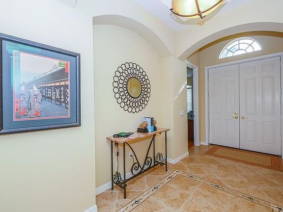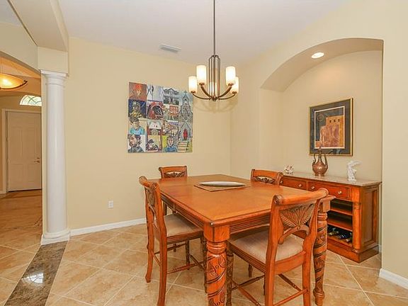 This beautiful and spacious Lee Wetherington 4 bedroom, 2-1/2 bath pool home has many desirable features. From the moment you walk through the double front doors into the foyer, you will notice the natural light that brightens throughout the home and a warm neutral color palette on the large diagonal floor tile and walls. There are lovely architectural arches, niches, pillars, built-ins and tray ceilings which enhance the charm of this home. The large kitchen features an abundance of stepped wooden cabinets with glass block windows below, corian counters and tiled backsplash, gas stove, an island with sink & breakfast bar and a large separate desk area. Sliders in the living room open to the inviting pool and spa area and tranquil lake views. The private master wing has an en-suite bathroom complete with tub, walk-in shower and dual sinks. New HVAC recently installed. Three car garage. CDD fee included in taxes. Located in the award winning community of Lakewood Ranch. Welcome to your HOME IN PARADISE!!