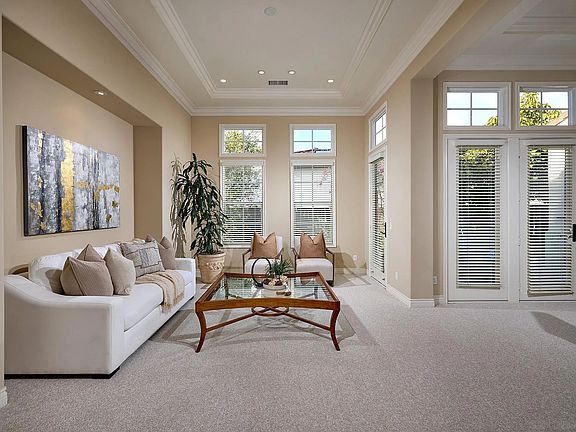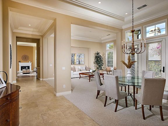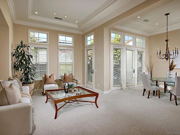 Rare SINGLE STORY on a PREMIUM LOT with westerly views in the desirable neighborhood of Viridian in La Costa Greens! This 3 BD/2.5 BA home features abundant privacy, soaring ceilings, recessed lighting, crown molding, and new carpeting, beautiful tile, and wood flooring. The spacious family room features a cozy fireplace, while the living room opens up to a relaxing courtyard. The kitchen is a chef's dream with upgraded cabinetry, stainless steel appliances, large island, and granite countertops. Lavish primary suite with spa-like bathroom & deep soaking tub. The extended his and hers closets are outfitted with custom built-ins. Outside, the backyard is a paradise with beautiful rose gardens, fruit trees, drought-friendly turf, and breathtaking views. The 2-car garage is equipped with epoxy flooring and built-ins. SOLAR! Residents of La Costa Greens enjoy exclusive access to "The Presidio" and its resort-like amenities, including a community pool, tennis courts, and a workout and recreation room. Plus, the convenient location puts you just minutes away from Alga Norte Park, Legoland, shopping, entertainment, and North County's best beaches. All of this within the top-rated Carlsbad School District. LIVE THE RESORT LIKE LIFESTYLE OF LA COSTA GREENS!