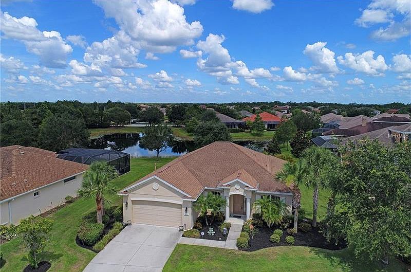 Custom Bruce Williams home on over a acre lot with pond view is now available! This beautiful home has 3 bedrooms, 2 bathrooms, den, formal dining room, open concept kitchen and living room space, spacious dinette, and a screened- in extended lanai overlooking the expansive lot and serene water view. Walking into the entryway you are greeted with stately columns, tray ceilings, crown molding, and an inviting atmosphere. The vaulted ceilings and open concept create a spacious and airy feel in the living room, kitchen, and breakfast nook. The kitchen has a pantry closet and a multitude of cabinets providing ample storage space. Entertaining is made easy as you can utilize both the large formal dining room and the extended dinette which features a large aquarium window providing stunning views of your oversized backyard and pond. A split floor plan places the two guest bedrooms and second bathroom off of the kitchen while the master is tucked away on the other side of the house. The owners suite features expansive water views and access to the lanai. Custom built-in shelving and drawers have been added to the larger of the His and Her closets providing extra organization and storage. Master bathroom has double sinks, garden tub, and walk- in shower. After a long day you can relax on the oversized, screened-in lanai and enjoy one of the only acre lots in Greenbrook Village. Located in Lakewood Ranch, Greenbrook provides an engaging lifestyle with plenty of parks, sports fields, and playgrounds.