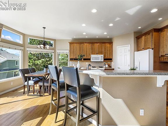 Welcome to your new home, nestled on a quiet cul-de-sac on the west side. This 6 bed, 4 bath home offers a luxurious sanctuary for you & your loved ones. Boasting a 3-car garage with a rare, flat, over-sized driveway, parking is easy & convenient. Step into the inviting embrace of the main floor, adorned w/beautiful hardwood floors throughout. A thoughtfully designed office on this level offers a versatile space for work or study. The living room is flooded w/natural light pouring through abundant floor to ceiling windows & provides breathtaking city views. The gas fireplace serves as both a warm focal point & a cozy spot on those snowy winter days. The open concept kitchen boasts granite countertops, a dual fuel applicance (stove is gas & oven is electric) & dovetail cabinet drawers. A large walk-in pantry accommodates all your storage needs, while the kitchen's access to the deck creates the perfect space to BBQ, entertain, & enjoy both the city & mountain views. For more formal gatherings, the dining room is a charming highlight, complete with a custom detailed floor pattern & built-in cabinets. Upstairs, the master bedroom is truly impressive. Enjoy sweeping views of the city & mountains right from your window. The attached 5-piece bath provides a luxurious escape & the large walk-in closet ensures you have ample wardrobe space. Two additional bedrooms down the hall share a beautifully updated bath, combining style with practicality. The large walk-out family room in the basement is the perfect flex space. Two more basement bedrooms & a 3/4 bath offer versatility & convenience, while a bonus storage room offers space to stay organized. Located walking distance from Ute Valley Park & Eagleview Middle School. Commuting is a breeze w/easy access to I-25, while the prestigious D20 school district adds to the desirability of this exceptional location. This property embodies the quintessential west side lifestyle, so don't miss your chance & schedule a showing today!