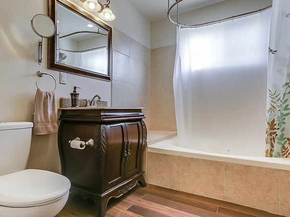 Stylish Top to Bottom Remodel with Rare 2 car Garage. Totally remodeled townhome featuring chestnut-colored wood flooring, large bedroom and large garage. Well-designed kitchen offers newer appliances, remote-controlled under cabinet lighting, fold out table for dining. Living area has deck access and wood-burning fireplace. All new bathroom has large soaking tub. Master features new lighting, dual closets and lots of natural light. New light fixtures throughout. Basement has laundry and utility sink. Garage is large with ample storage and workbench set-up. Enjoy community pool tennis and more.