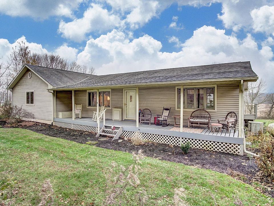 This spacious raised ranch home is situated on five beautiful acres of peace and quiet. The home offers 4 bedrooms and 3 baths, living room, lower level family room with fireplace, den, large country kitchen with dining room connected, main floor laundry, screened in porch off of kitchen, office/work out room, decks and patio over looking the private setting. The scene views on the front and back porch are incredible - a wonderful way to relax as you sit and enjoy a cup of coffee after a busy day at work. An over sized two car garage, plus a second garage 24x 36 and lean two 24 x12. Fenced in area for pets - close to the second garage. If your looking for a country property to call home - don't miss the opportunity! Call today for your appointment!
