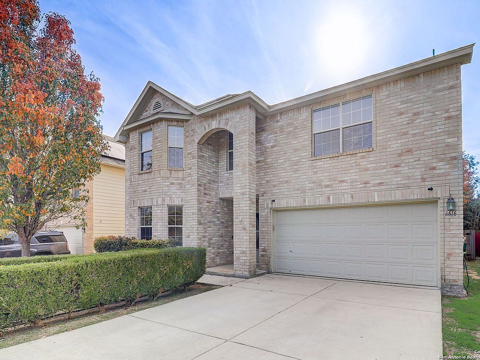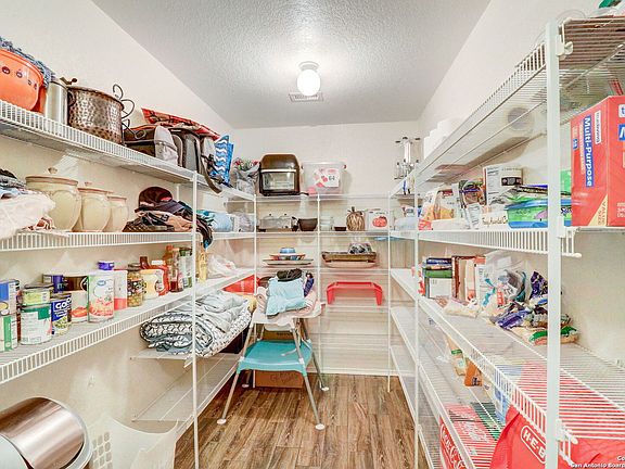 Introducing a spacious two story home in Live Oak, TX, perfectly situated on a greenbelt lot. This residence boasts a flexible floor plan, featuring three living areas and two dining areas, providing ample space for your lifestyle needs. The heart of the home, an island kitchen, showcases quartz counters, complemented by white cabinetry and a stylish tiled backsplash. A notable highlight is the expansive walk-in pantry, offering convenience and organization. Enhanced by updated light fixtures and recessed lighting, this home exudes a modern touch. The generously sized bedrooms include a primary suite that allows for a sitting area, complete with a full en suite bath featuring a relaxing garden tub. Step outside to discover the extended back patio, a private retreat perfect for entertaining. Enjoy the serene view of the swimming pool, providing a refreshing escape right in your backyard. This property combines comfort and elegance, making it the ideal home for those seeking spacious living in a picturesque setting.
