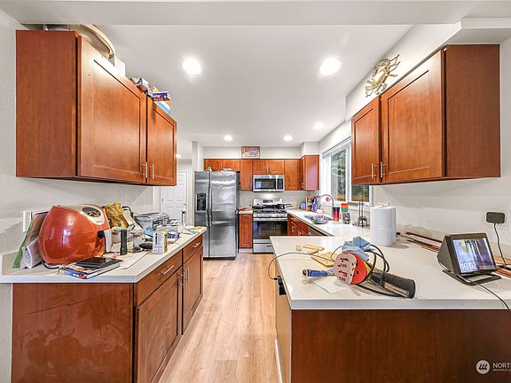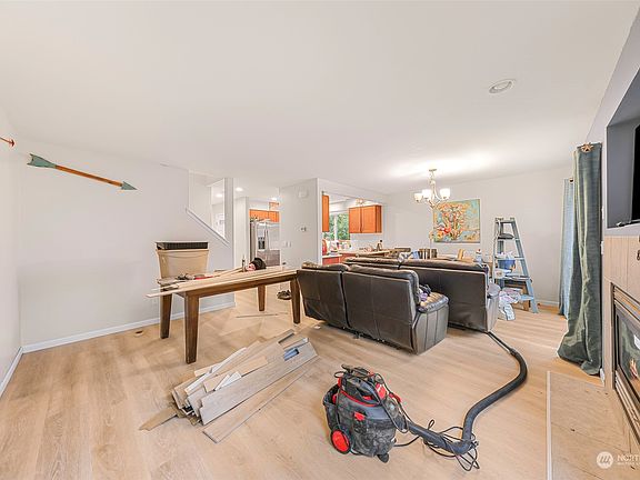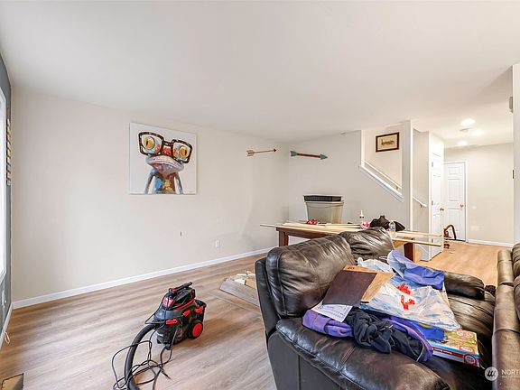 Great starter home on a large lot w/ native growth greenbelt backing on a quiet cul-de-sac. Main floor features Quartz kitchen w/ lots of counter space, bar seating & soft close cabinets, large living room w/ new flooring, cozy gas f/p & dining area. Upstairs find primary suite w/ vaulted ceilings, sky light & 5 piece en suite as well as oversize closet. 2 additional generous size bedrooms, full guest bathroom & full laundry room. Tons of yard space to play & entertain. 2 car garage & driveway parking space. Conveniently located w/ easy access to shopping/dining/hw9/I5 & community playground near by! Desirable Arlington School District.