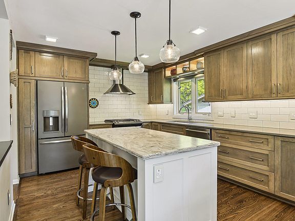 This charming brick home is nestled on a .3 acre, with 9 Mile Creek right off the back yard, in the Heights Neighborhood. Step thru the cute front door & enjoy all this home has to offer. The remodeled kitchen is open & has timeless custom cabinetry that flows into dining room, quartz counters, ss appl, & the perfect center island. The dining & living area are light, bright, with beautiful hardwoods and both walk out to the oversized deck. Enjoy the flex room possibilities, office, study, playroom or convert back to a bedroom. The primary bedroom is spacious with large windows & has a full bath. The 2nd bedroom has great space too. The walkout lower level is amazing with 2 large bedrooms, a huge family/rec room, and an extra large bath, Step out to the amazing back yard perfect for pets, entertaining, or just enjoying nature. The 2 car garage has a 80 sqft bump-in you can make your own. This home is steps to Heights Park, the 9 Mile boardwalk & bike trail. location, locations!
