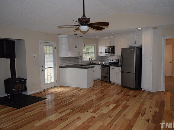 Scenic, quiet & secluded--this property offers a relaxing respite from city hustle & bustle. The open, bright living area combines with a compact floor plan featuring 2 beds, each with full bath. Living area has hickory hardwood floors, built-in shelving, & a wood stove. The kitchen includes wood cabinets & SS appliances.Outbuildings provide lots of storage opportunities, along with a workshop with elec & A/C. Large fence & garden areas. Unrestricted use & no HOA. Less than 20 min to Durham Regional.