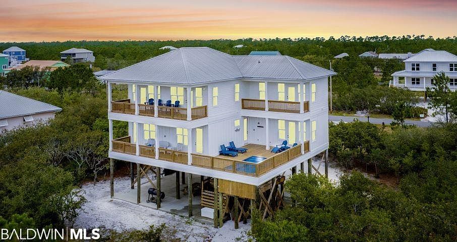 Welcome to DRIFTWOOD DUNES- where you'll enjoy GULF VIEWS, YOUR OWN PRIVATE POOL & EASY BEACH ACCESS! This GOLD FORTIFIED HOME was completed in November 2021 and offers 5 BEDROOMS/ 5 BATHROOMS, 3 SOUTH FACING DECKS AND AN ELEVATED POOL! The top-level has a spacious open concept kitchen, living & dining room. The Gulf facing wall is all windows & doors and leads out to one of the 3 decks. The fully equipped kitchen has QUARTZ countertops with ample seating at the large Island. The house is equipped with 2 full sized refrigerators, 2 dishwashers and a double oven. The top-level also has a King BR suite with a private bathroom, gulf views and private south facing Deck. The second level has 4 bedrooms and 4 baths. 3 of these bedrooms have King beds, Ensuite Bathrooms and private access to the Pool Deck. The 4th bedroom is the custom Bunk room with 2 full beds & 2 twin beds. Steps away from the pool on the second level, there is a morning bar with refrigerator and sink. The Ground Floor has an indoor entrance stairway with storage room. An enclosed shower is located under the home & there's ample room for parking under the home. Home is sold FULLY FURNISHED!! There is PRIVATE NEIGHBORHOOD BEACH ACCESS! Rental History Available. HOME WAS FEATURED ON HGTV IN JUNE 2023.