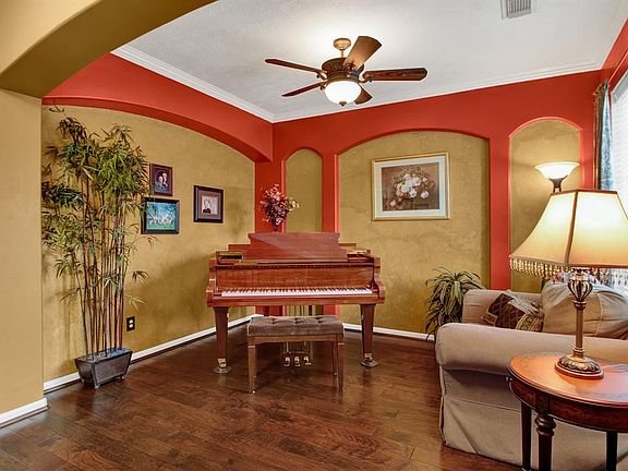 Quiet serenity and a backyard paradise awaits! This lovely home backs to a heavily treed greenspace, providing peace and tranquility in the garden-like backyard. Enjoy quiet evenings relaxing on the covered back patio or enjoying the therapeutic spa under the canopy of twinkling lights. The warm and welcoming ambiance of the interior is an equal delight! Upgraded hardwood floors throughout the entry, dining, study (piano room) and family room. The remodeled kitchen is truly the heart of this home featuring a massive center island with granite counters, updated backsplash, replaced sink and stainless steel appliances. Twin skylights provide an unexpected source of natural light in the spacious family room. Wrought island spindles line the stairs that lead to an oversized game room, media room, 3 secondary bedrooms and full bath. Roof replaced in 2016. Full sprinklers, updated garage door, full gutters w. gutter guards, security alarm, updated lighting & fans throughout.