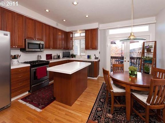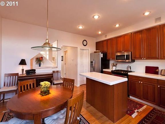 No HOA Fee's!Coveted John's Landing area. Amazing view of MT. Hood!Walk to area restraunts,shops & Park just a few minutes from downtown Portland.Brite Living Rm w/frplc,baywndw.Beautiful Kitchen w/Cherry cab's,Stainless Applcs,WoodFlrs,W/IPantry,Lrg Dining Rm,Master suite w/i closetSeperate bedroom suite in lower level,Fenced yard w/HtTub,A/C, GasHt,Newer Vinyl Windows & More