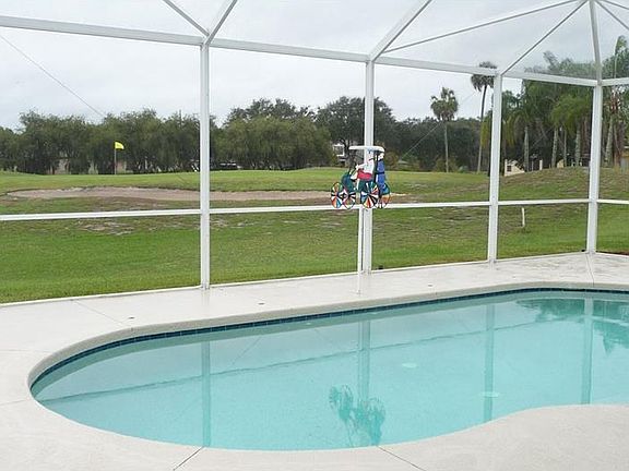 Golf Course Home with a solar heated pool. What a view of the course and you can watch them either sink the putt off to the right or hit the sand trap. Either way can be lots of entertainment if you so desire, and yet away from your home. The home sits on the golf path so you have extra space to the one side which allows for a possible patio outside the screened area which could be great for entertaining under the stars. This Ascot Lennar home is waiting for you. It is an open floor plan which allows for multi purposing the home. The second bedroom with French doors can easily be converted into an office or den. There is a new stainless refrigerator and new stainless sink in the kitchen. The 42 inch cabinets give that spacious feeling in the kitchen. The sliding glass doors are 8'. The whole house water system gives you soft showers with no soap scum and cleaner clothes with less detergent. The master bath is one of the largest in the area and the closet is amazing almost larger than some bedrooms. There is security lighting on the outside corners, security lock on the inside garage door. This meticulously maintained home is a great family home or retirement home. Moccasin Wallow is about to get a new shopping area with a Publix so when that happens all prices will go up, buy now before it does.