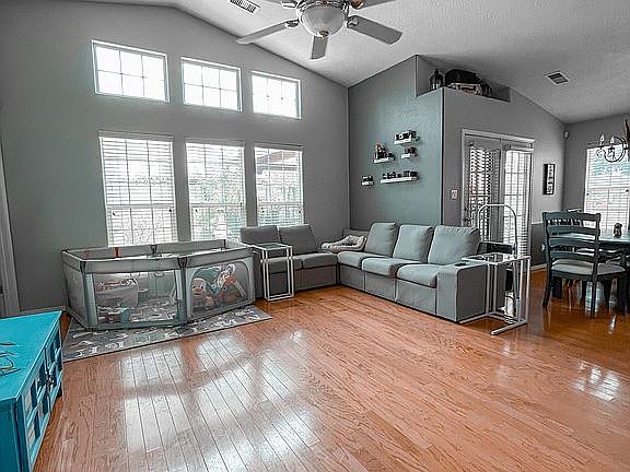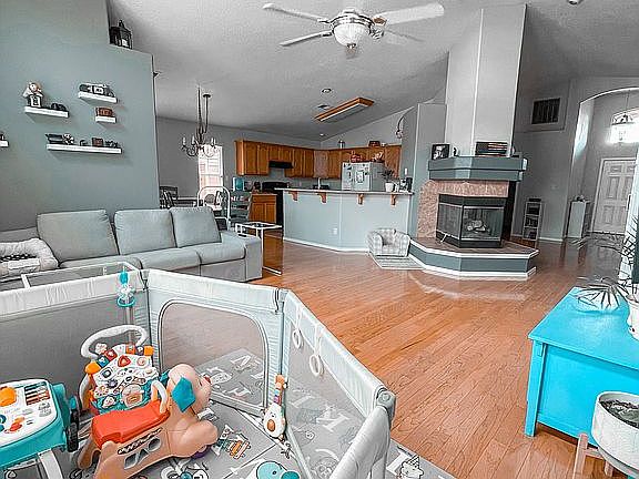 Great home, awesome floor plan 1800+ square feet. Corner lot. Features open kitchen, dining and living rooms. Gas fireplace. 3 bedrooms, 2 full baths, plus office and oversized garage. Hardwood floors in living, dining and office areas. Beautiful covered back porch and xeriscape back yard. Room for RV on the side. Security cameras. Easy access to freeway and shopping.