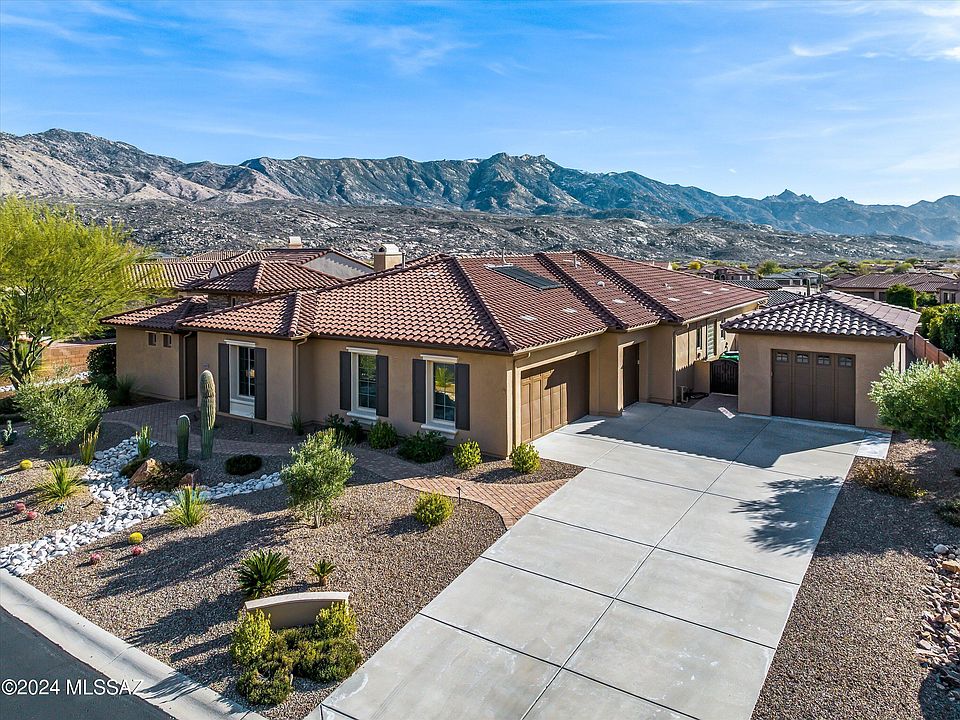 Dramatic south eastern facing mountain views from this highly impressive 3725 square foot Sonoran Model in The SaddleBrooke Preserve! Remodeled in 2022, this home boasts features that make it distinctive, yet extremely livable. Highlights include gourmet island kitchen with granite counters, alder cabinets, stainless appliances, built-in buffet, farmers sink & walk-in pantry. Additional features include large detached garage, AZ Room with limestone flooring, natural gas fire pit, coyote proof dog run & spacious casita. Many windows have electric shades inside & out. Complete office with integrated Murphy bed & expansive storage features. Hallways, kitchen & master closet have solar tubes which brings in natural light. Phenomenal mountain & sunset views complete this excellent value!