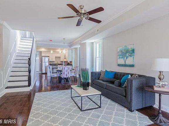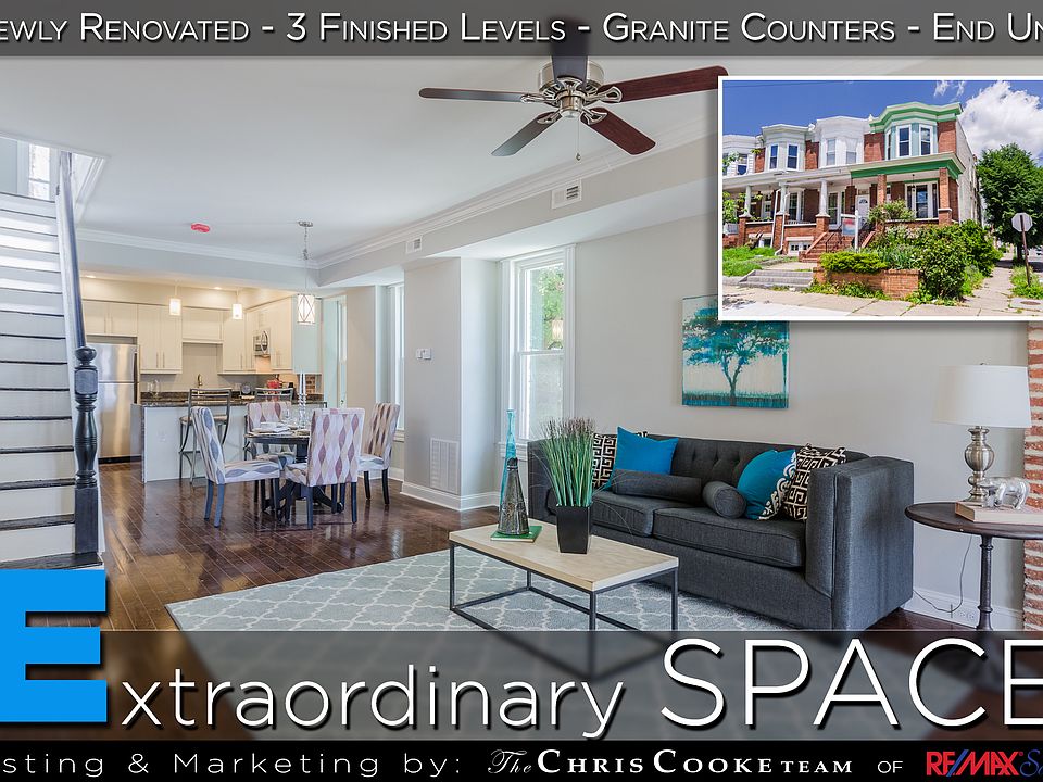 EXTRAORDINARY END OF GROUP RENOVATION WITH 3 FINISHED LEVELS! Hardwood floors throughout main level, spacious LR & dining area w/ crown molding, exp brick & wainscoting, Chef's kit w/ granite counters & ss appliances, kit level laundry, upper level with 2 beds & 1 full bath w/ clawfoot tub & sep shower, finished basement w/ 3rd bedroom & full bath, and fenced rear patio!