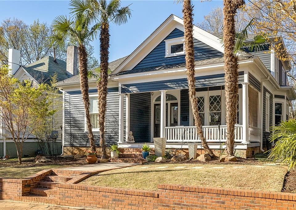 Welcome to 662 Rosalia, a beautifully re-imagined Victorian bungalow situated on one of the most beloved blocks in the heart of Atlanta's historic Grant Park district. As soon as you arrive, you'll be transported to a tropical oasis by the four towering windmill palms that welcome you to the property. Standing tall against the backdrop of the house's luxurious black exterior, these cold-hardy palms have been welcoming friends and guests for the past 18 years since they were first planted by the homeowners. As you step onto the front porch, the original diamond-patterned, 12-over-1 divided light windows, palladium transom, and tongue-and-groove porch floors catch your eye. But the real magic begins as you open the front door to a spacious living room with a grand central hallway, separating the living spaces from the downstairs bedrooms. The wide-plank solid hardwoods float beneath your feet as you explore the room. You'll also notice the original fireplaces with historic mantels and their original majolica tile in the living room and dining room. Don't miss the dining room's original stained glass buffet transom window. The primary bedroom boasts a luxurious atmosphere with recently installed wrap-around wallpaper, designer lighting, and custom drapery reminiscent of a South Beach resort. The recently renovated primary bathroom exudes sleek and sophisticated vibes and leads into a custom walk-in closet with ample storage space. On the main floor, a guest suite with similar features and a guest bathroom with convenient washer-dryer hookups await. A back door leads to the lush backyard area and a detached office space. As you ascend the stairs, you'll be greeted by a sprawling media/family area. At the end of the hallway, the accordioned French doors open up to a tranquil screened porch overlooking the lush backyard and even offering a glimpse of the downtown skyline in winter. Upstairs, you'll find two sizable secondary bedrooms, a hallway bathroom with dual vanity perfect for the kids, a convenient office space, and an oversized laundry room. The backyard is the epitome of a tropical oasis, complete with a patio kitchenette featuring a raised fire pit and stainless steel grill. The soothing sounds of waterfalls and streams flowing under boardwalk bridges add to the ambiance, while a crystal clear koi pond provides a peaceful spot for relaxation. An offset detached 1-car garage, transformed into an office space resembling a rainforest treehouse, is positioned at an angle from an open alley. The abundant variety of semi-tropical plants and palm trees contribute to the feeling of being transported to a luxurious Costa Rican retreat.