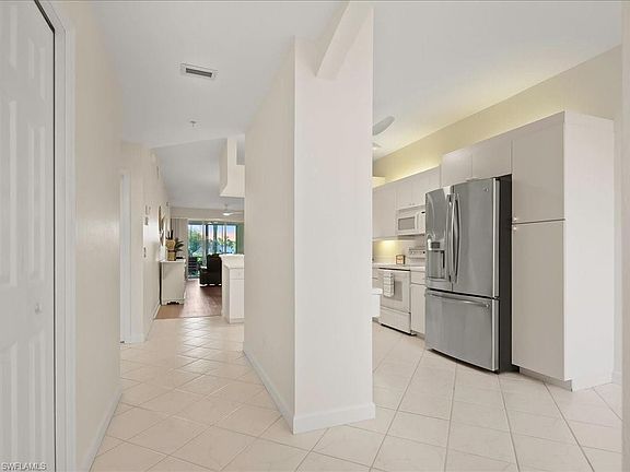 Welcome to this light and bright two bedroom two bathroom condo in Falling Water Beach Resort Community featuring a lazy river, pickleball, tennis courts and bocce ball to enjoy. The owner just completed many updates to this charming condo which is being sold turnkey. The property has been freshly painted top to bottom including walls, ceilings, closets, lanai walls, floor, lanai cabinetry and garage floor. New lighting and fans added to kitchen, dining room, living room and lanai. Master bedroom has brand new carpet. Enjoy the large lanai overlooking the water and water feature. The lanai has also been equipped with a new electric grill and beverage refrigerator and new no-see-um screens. This property is also equipped with electric storm protection shutters. Centrally located between Marco Island and downtown Naples.