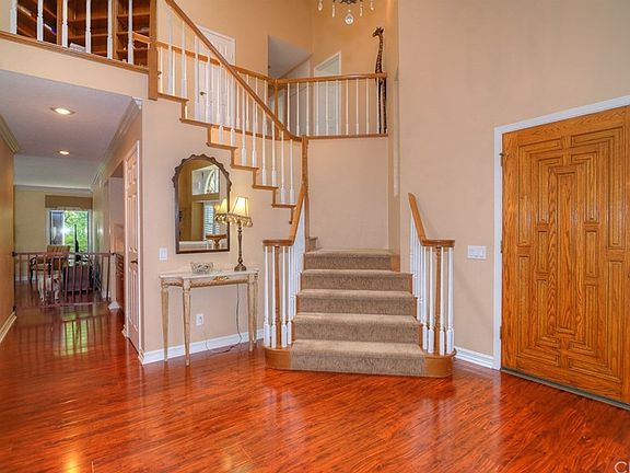 This beautiful 4 BR home is ideally situated in Orange's established neighborhood of Mabury Ranch. Seller has lovingly maintained and upgraded the home.The grounds are meticulous as is the interior with much attention to detail. Upgrades throughout the home include New Hardwood Floors downstairs, New carpet, baseboards, crown molding, new Lennox central air. Stunning remodeled kitchen with stainless steel appliances, cabinets and granite counter tops with full back splash. Kitchen offers a charming dining nook where you can gaze out onto the beautifully maintained yard with salt water Pool & Spa. Large Master Suite has a retreat area to relax~ walk in closet and dressing area. Interior Laundry Room. Large Flat Lot. Walking distance to wilderness trails. 3 CAR GARAGE with loads of room for storage and your toys, Property has soloar for low energy bills. LOW HOA.