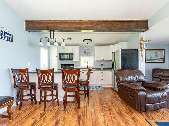 Enjoy panoramic views from this charming turn-key home beautifully positioned on a 1/2 acre lot boasting 154' of frontage on Grey Lake! This idyllic home offers beautiful views from every room of this spring fed, all sports lake! You'll find a remodeled kitchen w/snack bar, (appliances included), wood beams, new light fixtures, new flooring, updated bathroom, new vinyl siding, new metal roof 2016 & new furnace 2016. The large deck provides abundant seating with custom benches overlooking the lake & massive yard. The detached garage offers a guest room on the main level & a lower level area is ready to be finished as a recreation room; perfect for entertaining! Additional storage available in the 2-story barn. An incredible opportunity for an updated lake home!