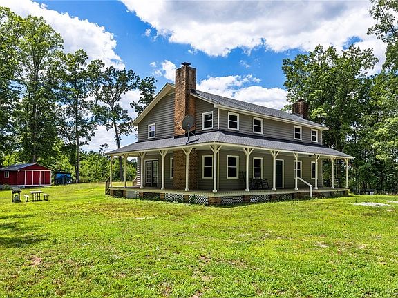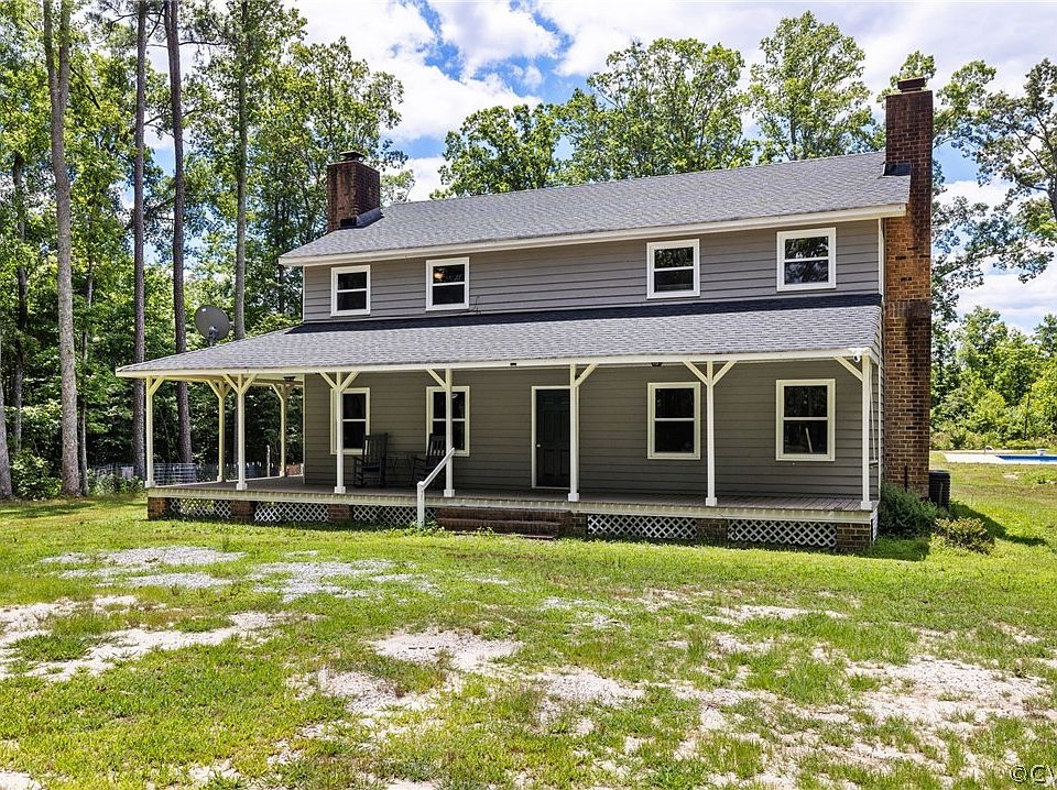 Escape to peaceful country living in Dinwiddie County on over 10 acres, offering the perfect setting for farm animals and gardening. Tucked away at the end of a private road, this charming farmhouse-style home offers seclusion and tranquility. Step onto the expansive 8-foot-wide wrap-around porch, an ideal spot for savoring your morning coffee while enjoying the natural beauty that surrounds you. Discover your backyard oasis for summer fun with a sparkling saltwater in-ground pool added in 2022. Benefit from long-term energy savings with solar panels installed in 2023. This inviting country home boasts over 2500 square feet of living space, featuring 4 spacious bedrooms and 3.5 bathrooms. Enjoy the convenience of dual primary suites, one on each floor for added flexibility and comfort. As you enter, you are greeted by a stunning two-story foyer leading to a cozy family room with a wood-burning fireplace and rich dark-stained trim, setting the perfect ambiance for relaxation. The updated kitchen features granite countertops and stylish stainless steel appliances. The first-floor primary suite offers a second wood-burning fireplace, a walk-in closet, and an updated private bath with luxury vinyl plank (LVP) flooring and a new vanity. Upstairs, discover three additional bedrooms, a renovated bath with a granite double vanity, and LVP flooring. The second-floor primary suite features yet another updated bathroom for added convenience. Exterior updates in 2020 include vinyl replacement windows, two new heat pumps, painted cedar siding, and a dimensional shingled roof. Outdoor amenities include a spacious shed with electricity and internet, and fenced areas perfect for farm animals. Multiple internet providers make this the ultimate remote work retreat. Conveniently located just off 460, enjoy an easy commute to Colonial Heights or Blackstone, with Fort Barfoot only 20 minutes away. Make this country retreat your own and create lasting memories in a place where the beauty of nature is right at your doorstep!
